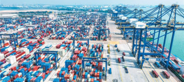 作为海南自贸港对外开放口岸,洋浦港承接了全岛超七成的进口货物量。图为繁忙的洋浦**集装箱码头。 张 茂摄(人民图片)